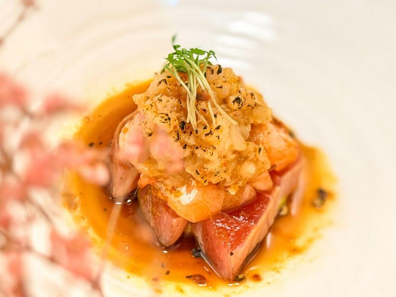 Leicht flambierter Thunfisch und Lachs trifft auf süße argentinische Rotgarnelen